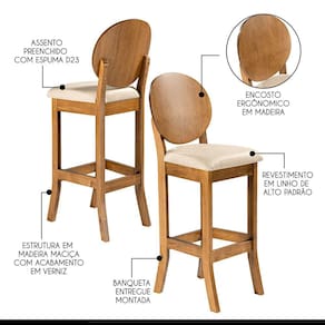 Kit de Banquetas Alta Florence promete ser o centro das atenções em todos os ambientes. Com um design exclusivo e moderno, a banqueta é perfeita para bancada de cozinha américa, balcão alto, mesa bar, espaço gourmet, cantinho do churrasco e muito mais. O destaque fica por conta do encosto ergonômico, dando um toque único a banqueta. Produzida com madeira maciça, garantindo a sua durabilidade e vida útil. CARACTERÍSTICA TÉCNICAS: - Produzido em Madeira Maciça - Acabamento em Verniz na cor Imbuia - Assento Estofado Preenchido com Espuma D23 - Tecido de Alta Qualidade Linho Bege M58 - Banqueta Entregue Montado INFORMAÇÕES TÉCNICAS: - Altura Total: 113 cm - Altura até Assento: 76 cm - Largura Total: 36 cm - Largura do Assento: 40 cm - Profundidade Total: 46 cm - Profundidade do Assento: 38 cm - Peso: 8 kg *Kit Composto por DUAS Banquetas Informações Adicionais: Garantia para defeitos de fabricação conforme Código de Defesa do Consumidor. *ATENÇÃO: Não nos responsabilizamos pela montagem, subir ou içar o móvel. *As imagens ambientadas são meramente ilustrativas e podem apresentar itens que não compõe o produto, as cores do produto podem variar de acordo com o monitor, a iluminação do ambiente ou sua percepção visual. *Limpeza: Deve ser feita com pano macio e seco ou levemente umedecido com água e sabão neutro. Não devem ser utilizados abrasivos.