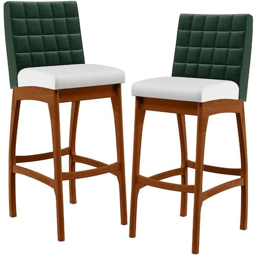 ndo muita excelência, o Kit 2 Banquetas Altas Cozinha Sala Jantar Fixa Mila B04 Facto Verde Musgo Corano Branco - Lyam Decor é o complemento que faltava para deixar sua casa ainda mais extraordinária. Seu encosto com costura em padrão quadriculado e assento estofados, centralizam em si uma graciosidade estonteante, sem perder todo o conforto. A estrutura em madeira, na cor nozes, também é digna de notoriedade, por imprimir bastante personalidade a sua decoração. Vale ressaltar ainda, o apoio para os pés que garante maior à banqueta.