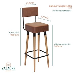 A banqueta Barcelona, possui 04 pés de madeira eucalipto com 60 cm de altura, e encosto estruturado, com seu design moderno, pode ser utilizada em sua área gourmet, área externa.