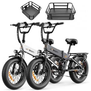 Kit com 2 bicicletas elétricas dobráveis Jasion com pneus fat 20x4, quadro em alumínio e suspensão dupla, indicado para uso adulto em cidade, cascalho, areia, neve leve, trilhas e passeios em montanha. A Hunter Pro combina motor traseiro brushless de até 1800W de pico, torque elevado para subidas íngremes e bateria de íons de lítio 48V 15Ah (720Wh), oferecendo velocidade máxima em torno de 48 km/h (30+ mph) e alcance de até aproximadamente 80 milhas por carga em modo de assistência ao pedal, conforme o nível de apoio, peso do ciclista e relevo.