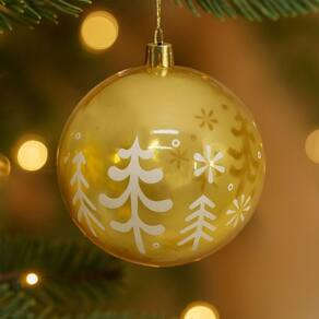 Com 10cm de diâmetro, é uma bola de tamanho grande que se destaca na composição de árvores, guirlandas ou arranjos decorativos. Fabricada em material translúcido com acabamento dourado e aplicação de estampa branca, une beleza e qualidade em um único item.