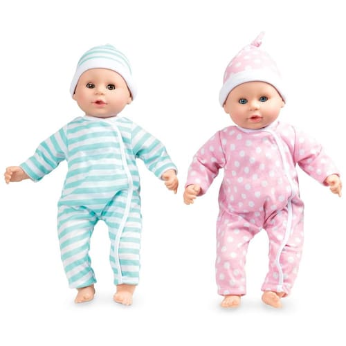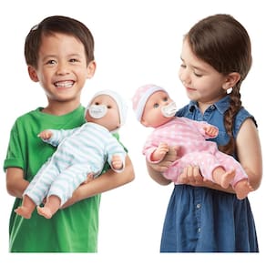 O conjunto de bonecas gêmeas Luke e Lucy, da Melissa Doug Mine, é perfeito para crianças de 18 meses a 5 anos. Com 38 cm de altura, os bonecos têm adoráveis macacões e bonés removíveis coordenados, olhos que abrem e fecham, e podem chupar o dedo ou as chupetas incluídas. Este conjunto é ideal para nutrir, abraçar e desenvolver habilidades sociais e emocionais das crianças. Além disso, o produto é enviado em sua própria embalagem especial de comércio eletrônico, destinada a ser mais fácil de abrir e reduzir o desperdício reciclável na calçada. Para completar a experiência de jogo prática e sem tela, você pode adicionar a boneca Mariana 12 Baby Doll da Melissa e Doug Mine. Por mais de 30 anos, a Melissa e Doug criou produtos lindamente projetados para estimular a imaginação e a criatividade que a NBC News chamou de padrão ouro nas brincadeiras da primeira infância.