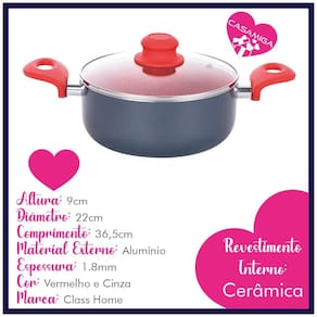 - Espessura: 1.8 mm - Material: Alumínio com revestimento cerâmico - Marca: Class Home - Cor: Cinza - Conteúdo: 2 Caçarolas
