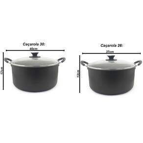 IMAGENS ILUSTRATIVAS Características: A Caçarola Grande Família é feita de alumínio reforçado, conferindo maior resistência ao produto. Conta com revestimento interno e externo de 5 camadas de antiaderente. A tampa de vidro possui furo para a liberação de vapor. As alças e o pomel são fabricados em baquelite antitérmico. Estas Caçarolas são fáceis de usar e limpar proporcionando maior praticidade e tempo na hora de preparar suas refeições. Especificações: - Tampa Vidro - Anti Aderente - Alças Baquelite - Caçarola 30,26 - Alumínio Peso e Medida: 30: - Peso: 1,378 - Altura: 17 cm - Diâmetro: 30 cm - Largura: 40 cm 26: - Peso: 1,234 - Altura: 15 cm - Diâmetro: 26 cm - Largura: 35 cm Itens Inclusos: - 01 Panela Caçarola 30 cm - 01 Panela Caçarola 26 cm - 02 Tampa de Vidro