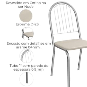 Conjunto 2 cadeiras 2C077, ideais para salas de jantar ou recepções. Estrutura em MDP (15 mm), corpo/ pés tubular em alumínio (Tubo 1 com parede de espessura 0,9mm), encosto com detalhes em arame 0,4mm. Estofadas com espuma D26 e revestido em Corino (material sintético que imita couro), além de sapatas para proteção ao piso. Este produto será entregue em 01 volume.