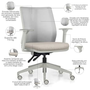 Peso máximo suportado 110 kg, com uso recomendado de 8 horas diária.