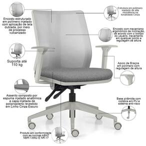 Color: CinzaCinza Escuro | ColorFamily: Cinza | ColorSimple: Cinza | ColorSupplier: CinzaCinza Escuro | Com apoio de braços: Sim | Com aro para pés: Não | Com rodas: Sim | Cor: CinzaCinza Escuro | Formato de venda: Kit 2 unidades | Materiais do aro para pés: na | Material: Polímero injetado, espuma injetada, tela dublada vulcanizada, rodízios em PU, revestimento em Linho | Material do estofamento: Espuma Injetada | MaterialFamily: Polímero | Model: Flow Diretor | Modelo: Flow Diretor | Modelo detalhado: Flow Diretor | OriginCountry: Brasil | OriginState: PR | ProductContents: 02 Cadeiras de Escritório | ProductHeight: 81 cm | ProductInstructions: Produto para uso em ambiente interno, nao devendo ficar exposto ao sol, calor e umidade excessivos. | ProductLength: 71 cm | ProductWarranty: 90 dias após o recebimento do produto | ProductWeight: 13 kg | ProductWidth: 71 cm | Requer montagem: Sim | SizeDescription: Altura: 81 cm x Largura: 71 cm x Profundidade: 71 cm | SupplierSimpleName: Kit 2 Cadeiras de Escritório Giratória Diretor Flow F02 Base Cinza Linho Cinza Escuro - Lyam Decor | Tipo de cadeira de escritório: Diretor Giratória
