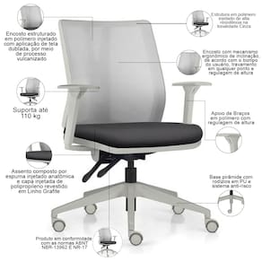 Peso máximo suportado 110 kg, com uso recomendado de 8 horas diária.