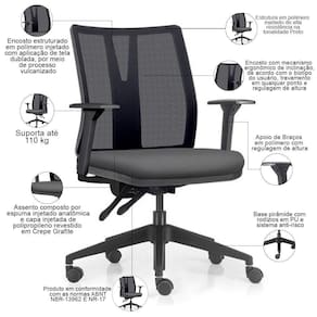 Peso máximo suportado 110 kg, com uso recomendado de 8 horas diária.