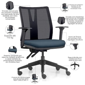Color: PretoAzul | ColorFamily: Preto | ColorSimple: Preto | ColorSupplier: PretoAzul | Com apoio de braços: Sim | Com aro para pés: Não | Com rodas: Sim | Cor: PretoAzul | Formato de venda: Kit 2 unidades | Materiais do aro para pés: na | Material: Polímero injetado, espuma injetada, tela dublada vulcanizada, rodízios em PU, revestimento em Sintét | Material do estofamento: Espuma Injetada | MaterialFamily: Polímero | Model: Flow Diretor | Modelo: Flow Diretor | Modelo detalhado: Flow Diretor | OriginCountry: Brasil | OriginState: PR | ProductContents: 02 Cadeiras de Escritório | ProductHeight: 81 cm | ProductInstructions: Produto para uso em ambiente interno, nao devendo ficar exposto ao sol, calor e umidade excessivos. | ProductLength: 71 cm | ProductWarranty: 90 dias após o recebimento do produto | ProductWeight: 13 kg | ProductWidth: 71 cm | Requer montagem: Sim | SizeDescription: Altura: 81 cm x Largura: 71 cm x Profundidade: 71 cm | SupplierSimpleName: Kit 2 Cadeiras de Escritório Giratória Diretor Flow F02 Base Preta Sintético Azul - Lyam Decor | Tipo de cadeira de escritório: Diretor Giratória