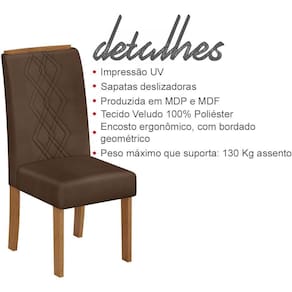 Kit 2 Cadeiras De Jantar 31073, com design moderno e sofisticado, são perfeitas para dar aquele toque especial no seu lar. Estrutura em MDF/MDP de 18 e 25 mm, proporcionando maior durabilidade e resistência à peça, contando com pintura em acabamento U.V (Fosco). Compostas por encosto estofado em espuma D-13, assento em espuma D-20, que trazem a combinação perfeita entre qualidade e conforto, revestimento em tecido Veludo (100% Poliéster), encosto ergonômico com bordado geométrico, espaldar de MDF usinado com bordas PVC, trazendo um diferencial para sua estética, além de, bordas em PVC, 4 pés em MDF de 25 mm, e acompanham sapatas deslizadoras, que facilitam o manuseio. Suporta até 130 Kg cada. Complemente sua sala de jantar com muito bom gosto e elegância, tornando seus momentos em família ainda mais aconchegantes. Este móvel chegará na sua casa separado em 01 volume.