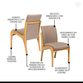 O Kit de Cadeiras Lisboa vai se tornar o protagonista no seu ambiente. Dispõe de um design atual, permitindo montar diversas composições e agregar na decoração e conforto. Podem ser utilizadas em mesas de jantar, apoio extra na sala de estar, complementar ambientes ou onde você precisar. A Cadeira Lisboa é produzida com materiais de excelente qualidade, garantindo sua durabilidade e vida útil. CARACTERÍSTICAS TÉCNICAS: - Produzida em Madeira Maciça - Acabamento em Verniz na cor Mel - Assento Estofado Preenchido com Espuma D23 - Encosto Estofado Preenchido com Espuma D18 - Revestimento em Tecido Linho na cor Marrom Claro L87 - Cadeira Entregue Montada INFORMAÇÕES TÉCNICAS: Altura Total: 90 cm Altura Chão + Assento: 50 cm Altura Encosto: 44 cm Largura Total: 52 cm Largura Assento: 60 cm Profundidade Total: 60 cm Profundidade Assento: 56 cm Peso: 8 kg *Kit Composto por 2 Cadeiras Lisboa INFORMAÇÕES ADICIONAIS: Garantia para defeitos de fabricação conforme Código de Defesa do Consumidor. *Não nos responsabilizamos por subir ou içar o produto. **As imagens ambientadas são meramente ilustrativas e podem apresentar itens que não compõe o produto, as cores do produto podem variar de acordo com o monitor, a iluminação do ambiente ou sua percepção visual. ***Limpeza: Deve ser feita com pano macio e seco ou levemente umedecido com água e sabão neutro. Não devem ser utilizados abrasivos.