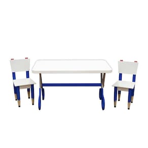 Kit 2 Cadeiras E Mesa Infantil Tesoura Azul Tampo Branco Retangular Base Temática Para Estudos E Desenhos Mobília Decor Conjunto Mesinha Pé Tesoura + 2 Cadeiras Pé Lápis Borracha Conjunto infantil robusto com mesa de base em ?tesoura? e duas cadeiras com pés em formato de lápis (amarelo), ideal para atividades, desenhos e leitura em quartos, brinquedotecas e escolinhas, unindo estabilidade, conforto e cores vibrantes.? Mesa: 53 cm de altura; 90 x 50 cm; 18 kg; suporta até 10 kg; tampo em MDF/madeira com pintura tinta e interno Branco TX; pés em MDF no formato tesoura, fixação por parafusos; acompanha acessórios e necessita montagem.?