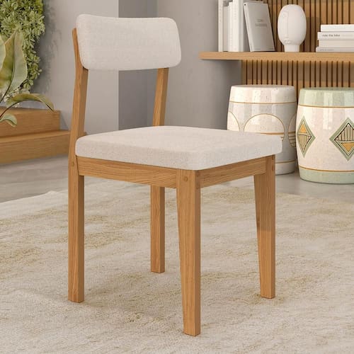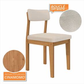 Detalhes Técnicos das Cadeiras: - Material da Estrutura: MDF 25mm e 18mm - Acabamento da Cadeira: Assento e Encosto Tapeçados - Assento/Encosto: D16 - Peso Suportado da Cadeira: 90 KG distribuídos - Facilidade da Montagem: Média - Tonalidade da estrutura da Cadeira: Cinamomo - Tonalidade do Tecido: Bouclé Off White - Pintura: UV Texturizada - Borda em PU