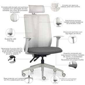 Peso máximo suportado 110 kg, com uso recomendado de 8 horas diária.