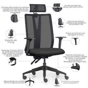 Peso máximo suportado 110 kg, com uso recomendado de 8 horas diária.