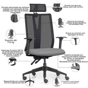 Equipada com um mecanismo Evolution, um sistema de contato permanente, essa cadeira giratória abraça as suas necessidades, permitindo ajustes precisos na altura do assento, do encosto e dos braços. Cada detalhe foi pensado para proporcionar um suporte ideal, respeitando o biotipo do usuário e promovendo uma postura saudável durante longas horas de trabalho. Já a base pirâmide, adornada com rodízios em PU e sistema anti-risco, desliza suavemente sobre qualquer superfície, garantindo movimentos ágeis e seguros. Por fim, o encosto com apoio de cabeça completa a experiência, permitindo que você se concentre no que realmente importa, enquanto sua mente flui livremente.