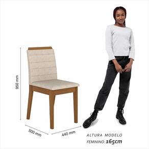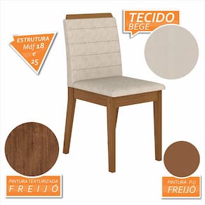 Detalhes Técnicos das Cadeiras: - Acabamento da Cadeira: Assento e Encosto Tapeçados - Almofada do Assento: Fixa - Cadeira Estofada: Sim - Peso Suportado da Cadeira: 90 KG - Facilidade da Montagem: Médial - Tonalidade da estrutura da Cadeira: Freijó - Tonalidade do Tecido: Suede Bege - Assento: D16 - Encosto: D14 - Tipo de Pintura: UV Texturizada - Material da Estrutura: MDF 25mm e 18mm - Medida da Cadeira: 95CM x 44CM x 50CM