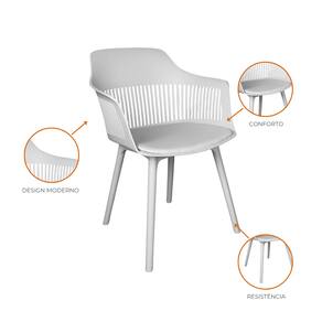 Estrutura em polipropileno (PP), material durável e leve, com assento estofado em poliuretano (PU), proporcionando excelente conforto.