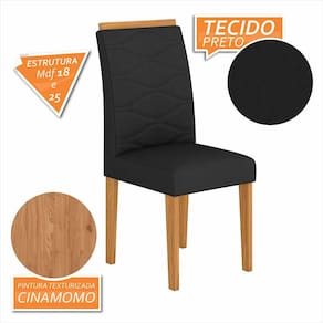 Detalhes Técnicos das Cadeiras: - Acabamento da Cadeira: Assento e Encosto Tapeçados - Almofada do Assento: Fixa - Cadeira Estofada: Sim - Peso Suporte da Cadeira: 90 KG - Facilidade da Montagem: Medial - Tonalidade da Cadeira: Cinamomo - Tonalidade do Tecido: Suede Preto - Assento: D16 - Encosto: D14 - Tipo de Pintura: UV Texturizada - Material da Estrutura: MDF 25mm e 18mm - Medida da Cadeira: 100CM x 44CM x 50CM