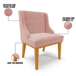 A Cadeira Lia é produzida em Madeira Eucalipto ecologicamente correta e a base fixa de madeira suporta até 120 kg, sem impacto. Seu estofamento é composto por espuma macia densidade D-23 e revestida em Veludo, tecido clássico, elegante, resistente, confortável e de toque macio.