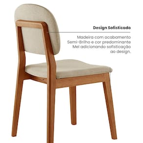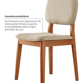 CadeirasDimensões: 90 cm (A) x 49 cm (L) x 54 cm (P)Peso da Cadeira: 8 kgPeso do Kit: 16 kgMaterial da Estrutura: MDF e Madeira MaciçaRevestimento: Linho, Veludo ou Material SintéticoEnchimento do Assento: Espuma D-28 (fixa)Enchimento do Encosto: Espuma D-20Estrutura do Assento: MDF com espuma D-28 de 30 mmAcabamento: Verniz NaturalPeso Suportado: Até 130 kg