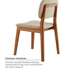 CadeirasDimensões: 90 cm (A) x 49 cm (L) x 54 cm (P)Peso da Cadeira: 8 kgPeso do Kit: 16 kgMaterial da Estrutura: MDF e Madeira MaciçaRevestimento: Linho, Veludo ou Material SintéticoEnchimento do Assento: Espuma D-28 (fixa)Enchimento do Encosto: Espuma D-20Estrutura do Assento: MDF com espuma D-28 de 30 mmAcabamento: Verniz NaturalPeso Suportado: Até 130 kg