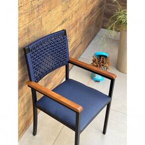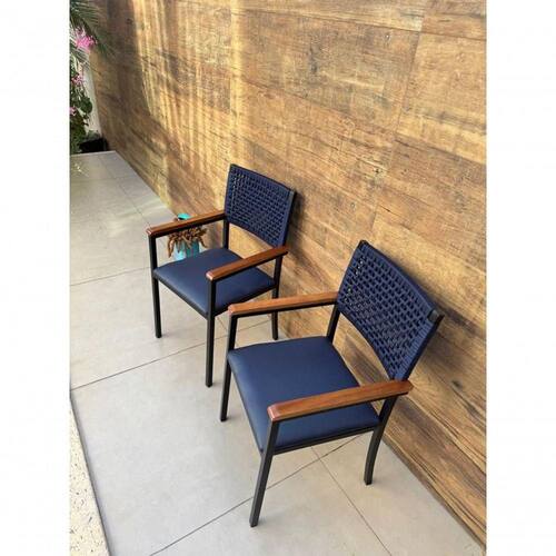 O assento estofado em material sintético de alta qualidade, na cor azul marinho, é fácil de limpar e proporciona um toque de sofisticação. O encosto trançado em corda náutica confere um charme artesanal, além de garantir conforto ergonômico e excelente ventilação. Os braços em madeira natural adicionam um contraste acolhedor e refinado ao conjunto, destacando o equilíbrio entre o estilo rústico e o contemporâneo.
