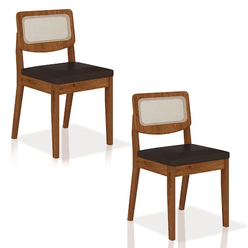 Detalhes Técnicos das Cadeiras - Assento Tapeçado, Estofado e Fixo - Encosto com Tela Sextavada - Palha Sintética - Tecido Corino - Estrutura: MDF - Tonalidade: Freijó/Corino Marrom - Medida: A: 84CM x L: 53CM x P: 45CM - Do chão até o assento possui 47cm - Suporta até 90kg (cada)