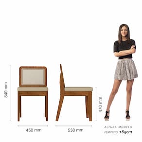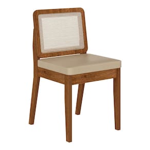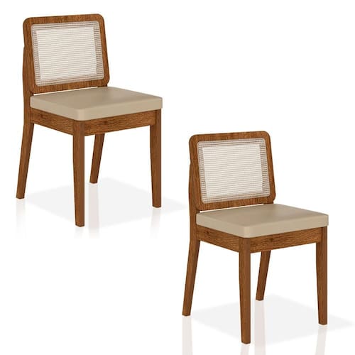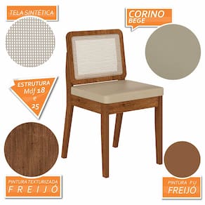 Detalhes Técnicos das Cadeiras - Assento Tapeçado, Estofado e Fixo - Encosto com Tela Sextavada - Palha Sintética - Tecido Corino - Estrutura: MDF - Tonalidade: Freijó/Corino Bege - Medida: A: 84CM x L: 53CM x P: 45CM - Do chão até o assento possui 47cm - Suporta até 90kg (cada)