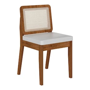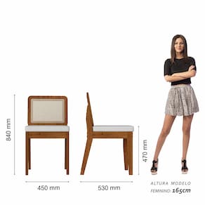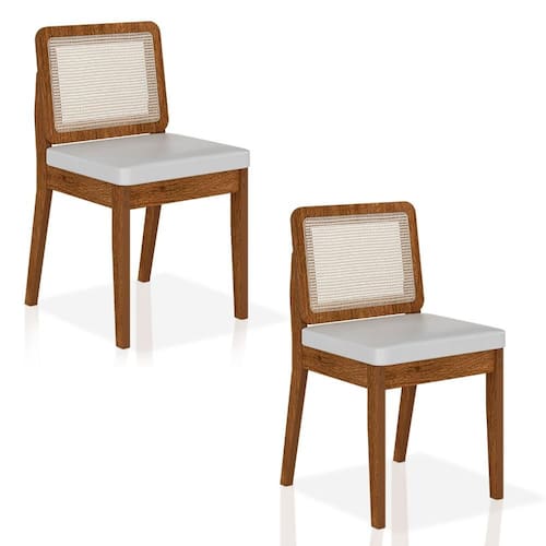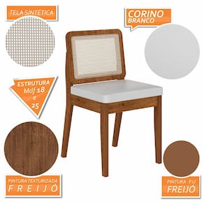 Detalhes Técnicos das Cadeiras - Assento Tapeçado, Estofado e Fixo - Encosto com Tela Sextavada - Palha Sintética - Tecido Corino - Estrutura: MDF - Tonalidade: Freijó/Corino Branco - Medida: A: 84CM x L: 53CM x P: 45CM - Do chão até o assento possui 47cm - Suporta até 90kg (cada)
