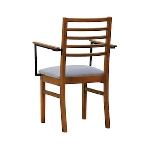 - Materiais: Estrutura em madeira de eucalipto maciço, assento estofado e encosto ripado, braços em aço de carbono com pintura epóxi e madeira tingida na cor amêndoa.