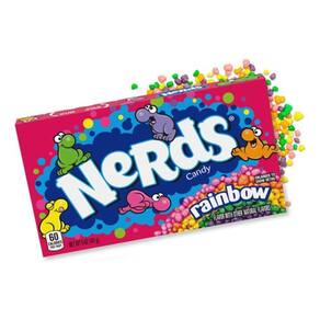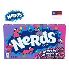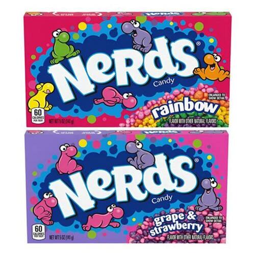 Cada caixa contém 141g de pura diversão e sabor. Desfrute da combinação clássica de Nerds Grape & Strawberry, que traz o delicioso contraste entre o sabor suculento da uva e a doçura vibrante do morango, junto com a explosão de cores e sabores da Nerds Rainbow, que reúne uma variedade de sabores frutados em um único pacote.