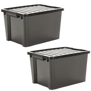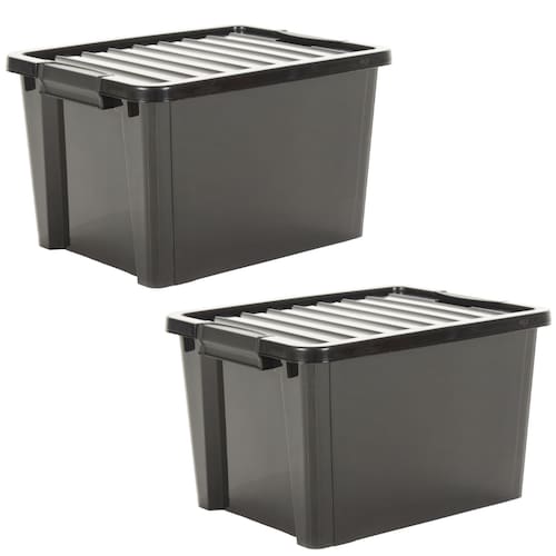 Prático conjunto de contentores LifeBox pretos multiusos de 50 litros com tampas herméticas de alta resistência que permitem empilhá-los para poupar espaço. Todos os nossos produtos têm garantia de 6 meses.