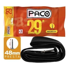 Este é um conjunto de duas câmaras de ar para bicicleta, adequadas para aros de 29x1.95/2.125. As câmaras são feitas de borracha butílica, um material conhecido pela sua elevada impermeabilidade aos gases e ao ar. Além disso, a borracha butílica é resistente ao calor e ao envelhecimento causado pela intempérie. Também é resistente a produtos químicos, gorduras e substâncias fortemente oxidantes. As câmaras possuem uma válvula presta de 48mm. O produto é da marca Paco. Marca: Não Informado