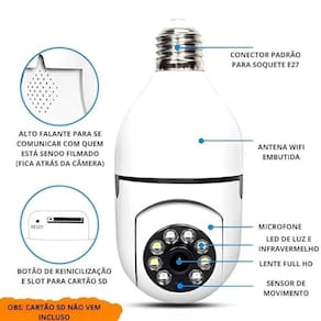 Kit 2 Câmera De Segurança Lâmpada Wifi Prova D'agua Infravermelho Interna.Externa Cor Branco - Camera, Giratória, 360 Camera Lâmpada Wifi Ip Segurança Panoramica Giratoria Esta câmera dome é perfeita para combater vandalismo e situações adversas graças à sua excelência em durabilidade. Sua cúpula é fechada em uma caixa resistente, o que ajudará a mantê-la protegida contra solavancos e empurrões. Tem uma resolução Full HD pela qual você será capaz de gravar com a melhor qualidade e, assim, ter uma vigilância clara e precisa sobre seus espaços. Graças à sua função de visão noturna incluída, você não precisará mais se preocupar com a iluminação dos seus espaços Apenas uma câmera consegue cobrir uma área bem maior do que uma câmera comum. Você consegue girar a imagem através do celular e controlar o zoom. É possível acender a luz remotamente através da internet, conversar com quem está no local e você ouve tudo o que está sendo falado onde a câmera esta instalada. Sistema extremamente simples de instalar, basta colocar em um bocal de lâmpada comum, tem o tamanho e formato de uma lâmpada de led comum, discreto. Conecta-se a sua rede wifi e a partir daí você pode visualizar e interagir de qualquer lugar do mundo através do seu celular ou tablet. Se alguém entra no ambiente você receberá uma mensagem em seu telefone e poderá visualizar/interagir com a pessoa. CARACTERÍSTICAS Auto Tracking - Rastreamento Automático Monitoramento 360o - inclinação automática ou por controle remoto Sistema Night Vision - Visão Noturna e Diurna com Infra Vermelho Alarme de movimentação - Dispara o alarme no seu celular ao detectar movimentos suspeitos Sistema de áudio - Microfone com gravador de áudio detecta todos os sons do ambiente Alta Durabilidade - Câmera tem o grau de proteção IP44 Proteção contra respingos de água. Não orientamos a instalação em áreas totalmente descobertas Acesso Remoto - Movimentação manual via controle remoto através do seu celular CARACTERISTICAS: Compatível com o APP Yoosee Compativel apenas wifi 2.4ghz, não é compatível com 5Ghz Conexão móvel 1080p Full HD - 2MP Controle ptz: 355 graus horizontal e 100 graus vertical Detector de movimento: quando o dispositivo detectar movimento de uma pessoa, automaticamente ela seguirá o movimento do alvo. Armazenamento por Cartão TF/microSD: Máximo de 128GB Visão noturna colorida com LEDs brancos pode ser desativada Áudio bidirecional: possibilitando a conversa entre o celular e a câmera Grau de proteção: IP44 Consumo de energia: 3w Compressão de vídeo: Smart H.264 Lente: 3.6mm Dimensões: 3x6,5x3cm Peso: 350gr Cada ITENS INCLUSOS: 2 Câmera Lâmpada 3D 2 Suporte para Fixação E27 2 Manual de instruções 2 Kit Parafusos Homologação Anatel: 112572013224 Marca: Não Informado