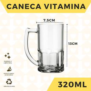 DESCRIÇÃO: A Caneca Vitamina ou Chopp 320ML são especialmente desenhadas para não influenciar no sabor da cerveja, são robustas e muito resistentes, sua alça bem fixada com apoio para o polegar auxilia na segurança da caneca, para momentos especiais. Muito resistente e elegante, irá se tornar uma peça indispensável para completar o bar, restaurante ou até mesmo sua cozinha. CUIDADOS: Para limpeza, remova a sujeira com uma esponja macia, tire todo o resíduo de sabão e seque bem; Não utilize abrasivos ou utensílios pontiagudos; Submeter o vidro a mudanças bruscas de temperatura pode causar choque térmico e danificar seu produto; Evite impacto. INFORMAÇÕES ADICIONAIS: MODELO: Caneca Vitamina COR: Transparente MATERIAL: Vidro ALTURA: 13CM DIÂMETRO: 7,5CM CAPACIDADE: 320ML PESO: 500G Ean: 7808113459028