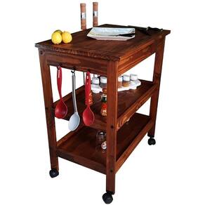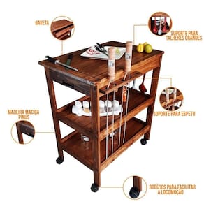 Super funcional, possui suportes para espeto, talheres e facas, com prateleiras para acomodar os utensílios domésticos organizadamente e rodízios para auxiliar na locomoção e tornar tudo mais fácil. Proporciona mais espaço no preparo das refeições, seja para a cozinha, um espaço gourmet ou área de lazer, é muito convidativo e com certeza dará um up em sua decoração!