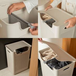 A abertura frontal permite inserir peças pequenas sem esforço, mantendo a tampa basculante fechada e o ambiente sempre em ordem. Com design robusto (30x42x55cm) se adapta bem à lavanderia, closet ou banheiro. Funcional, versátil e pensado para otimizar o seu dia.