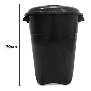 A Lixeira Preta Cesto De Lixo Grande Cozinha 100 Litros Reforç vem com tampa, também em plástico reforçado, que ajuda a conter odores e manter a higiene do local. O design de piso facilita a colocação em qualquer espaço, enquanto as bordas arredondadas asseguram segurança e praticidade na limpeza. Este modelo não possui rodas, o que confere estabilidade e evita deslocamentos indesejados.