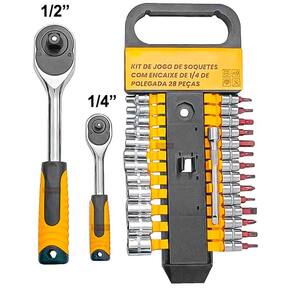 Conjunto de ferramentas com duas chaves catracas reversíveis, soquetes, bits e extensor, indicado para manutenção automotiva, elétrica, mecânica e montagem de móveis.