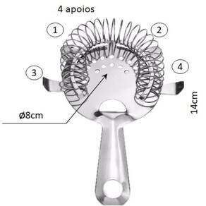 Modelo Hawthorne Strainer com 4 apoios, todo fabricado em aço inox que proporciona maior durabilidade e de fácil limpeza.