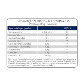 Ingredientes: Óleo de Soja (Glycine max), Coenzima Q10; Cápsula: Gelatina, Água Purificada, Umectante (INS 422) e Corantes (INS 150a e INS171). ALÉRGICOS: CONTÉM DERIVADOS DE SOJA. NÃO CONTÉM GLÚTEN.