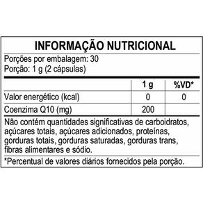 Ingredientes: Coenzima Q10, lubrificante talco e antiumectante Estearato de magnésio. Cápsula: gelatina e água deionizada. NÃO CONTÉM GLÚTEN. Sugestão de Uso: Ingerir 2 cápsulas ao dia. Recomendação de uso: Pessoas com 19 dezenove anos ou acima. Isento de registro no M.S. Conforme RDC 240/2018. Marca: Não Informado