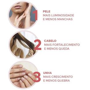 Ingredientes: Peptídeos bioativos de colágeno hidrolisado com peso molecular médio de 2kDa, romã em pó, ácido ascórbico vitamina C , bisglicinato de zinco zinco , D-biotina, aromatizante idêntico ao natural, antiumectante dióxido de silício, acidulante ácido cítrico, corante vermelho beterraba e edulcorante glicosídeos de steviol.