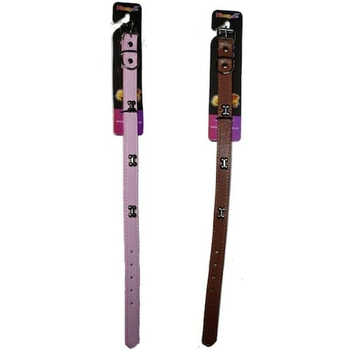 - coleira em couro sintético; - confortável e muito estilosa; - ótima para deixar seu pet ainda mais charmoso; - com aplique de osso; - para cachorros de médio e grande porte; - cores: marrom e rosa;