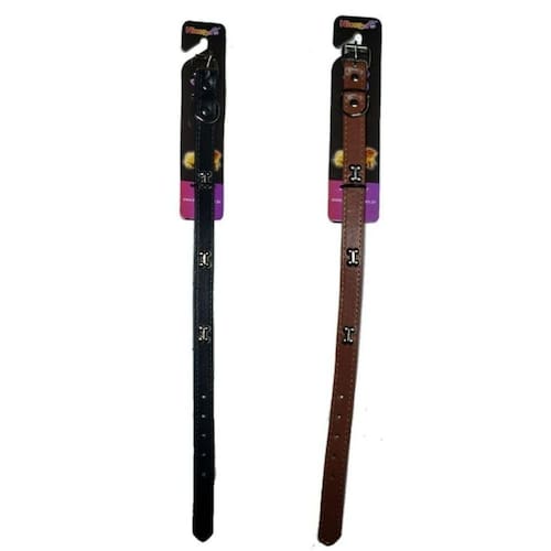 - coleira em couro sintético; - confortável e muito estilosa; - ótima para deixar seu pet ainda mais charmoso; - com aplique de osso; - para cachorros de médio e grande porte; - cores: marrom e preto ;
