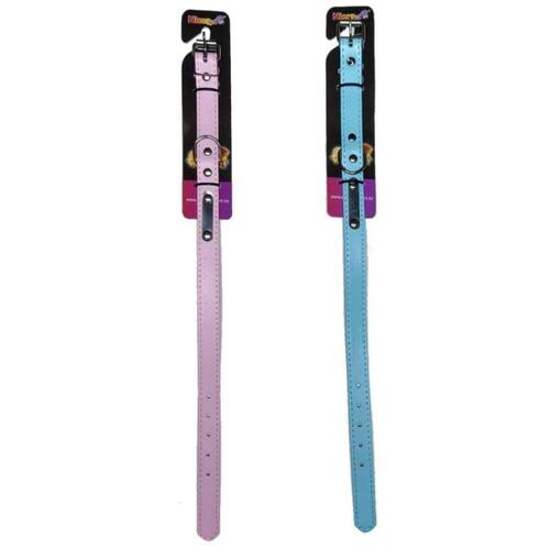 - coleira no couro sintético; - confortável e muito estilosa; - ótima para deixar seu pet ainda mais charmoso; - para todos os tipos de animais e tamanhos; - resistente e com um ótimo material; - com plaquinha de identificação; - cores: rosa e azul claro;