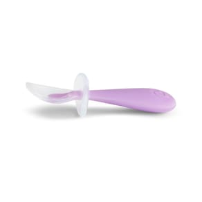 Kit com 2 colheres de silicone infantil rosa da Munchkin, com escudo de proteção. As colheres são flexíveis e macias, ideais para a alimentação do seu bebê.