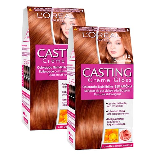 Produto indicado para colorir ou retocar os fios. Por ser sem amônia, Casting respeita todos os formatos de cabelos e é compatível com os fios quimicamente tratados. Coloração ideal para dar um banho de brilho, retocar ou colorir os primeiros fios brancos. Precauções : As contra indicações estão descritas na parte lateral do pack e na bula. Composição/Material: 1206812 – CREME COLORANTE: AQUA / WATER, CETEARYL ALCOHOL, PROPYLENE GLYCOL, DECETH-3, LAURETH-12, ETHANOLAMINE, OLETH-30, LAURIC ACID, POLYQUATERNIUM-6, GLYCOL DISTEARATE, SODIUM METASILICATE, HEXADIMETHRINE CHLORIDE, SILICA DIMETHYL SILYLATE, CI 77891 / TITANIUM DIOXIDE, CI 77491 / IRON OXIDES, m-AMINOPHENOL, p-AMINOPHENOL, ASCORBIC ACID, MICA, SODIUM METABISULFITE, THIOLACTIC ACID, THIOGLYCERIN, TOLUENE-2,5-DIAMINE, 2-METHYL-5-HYDROXYETHYLAMINOPHENOL, 2-METHYLRESORCINOL, CARBOMER, RESORCINOL, EDTA, PARFUM / FRAGRANCE. (C202447/1). 1190014 – LEITE REVELADOR: AQUA / WATER, HYDROGEN PEROXIDE, CETEARYL ALCOHOL, SODIUM SALICYLATE, TRIDECETH-2 CARBOXAMIDE MEA, PHOSPHORIC ACID, CETEARETH-25, TETRASODIUM ETIDRONATE, TETRASODIUM PYROPHOSPHATE, GLYCERIN. (C202315/2).1143027 C - TRATAMENTO CONDICIONADOR BANHO DE BRILHO COM GELEIA REAL: AQUA / WATER, CETEARYL ALCOHOL, STEARYL ALCOHOL, BUTYLENE GLYCOL, BEHENTRIMONIUM CHLORIDE, ISOPROPYL MYRISTATE, CETRIMONIUM CHLORIDE, CI 17200 / RED 33, CI 19140 / YELLOW 5, SODIUM BENZOATE, PHENOXYETHANOL, PPG-3 CAPRYLYL ETHER, CHLORHEXIDINE DIHYDROCHLORIDE, DIMETHICONE, LIMONENE, LINALOOL, BENZYL ALCOHOL, ISOPROPYL ALCOHOL, ALOE BARBADENSIS LEAF JUICE, CITRONELLOL, CITRIC ACID, POTASSIUM SORBATE, HEXYL CINNAMAL, AMYL CINNAMAL, ROYAL JELLY, PARFUM / FRAGRANCE. (B193416/1).